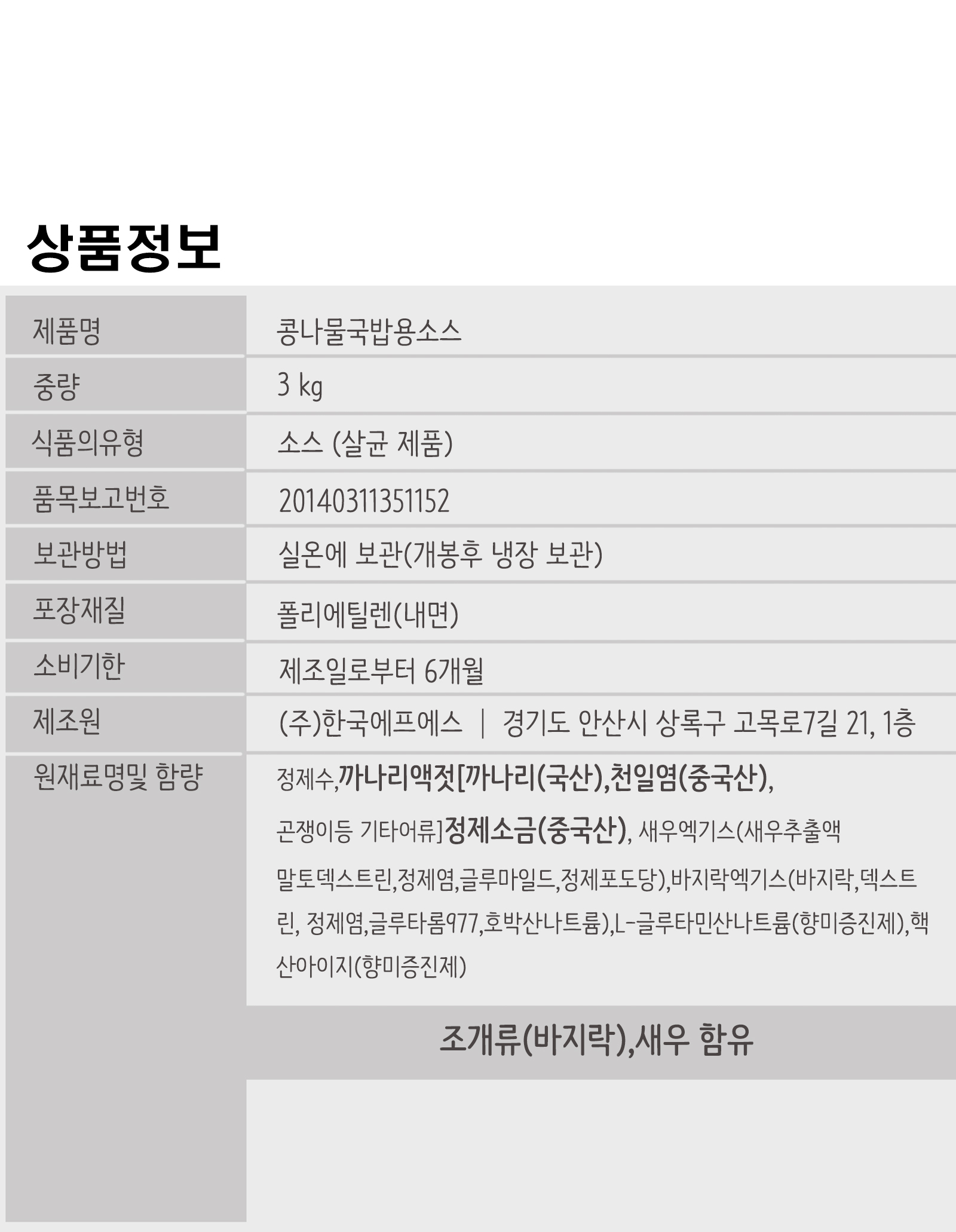 | 제조사 | (주)한국에프에스 | 원산지 | 까나리액젓[까나리(국산), 정제염(중국산)],바지락(중 |