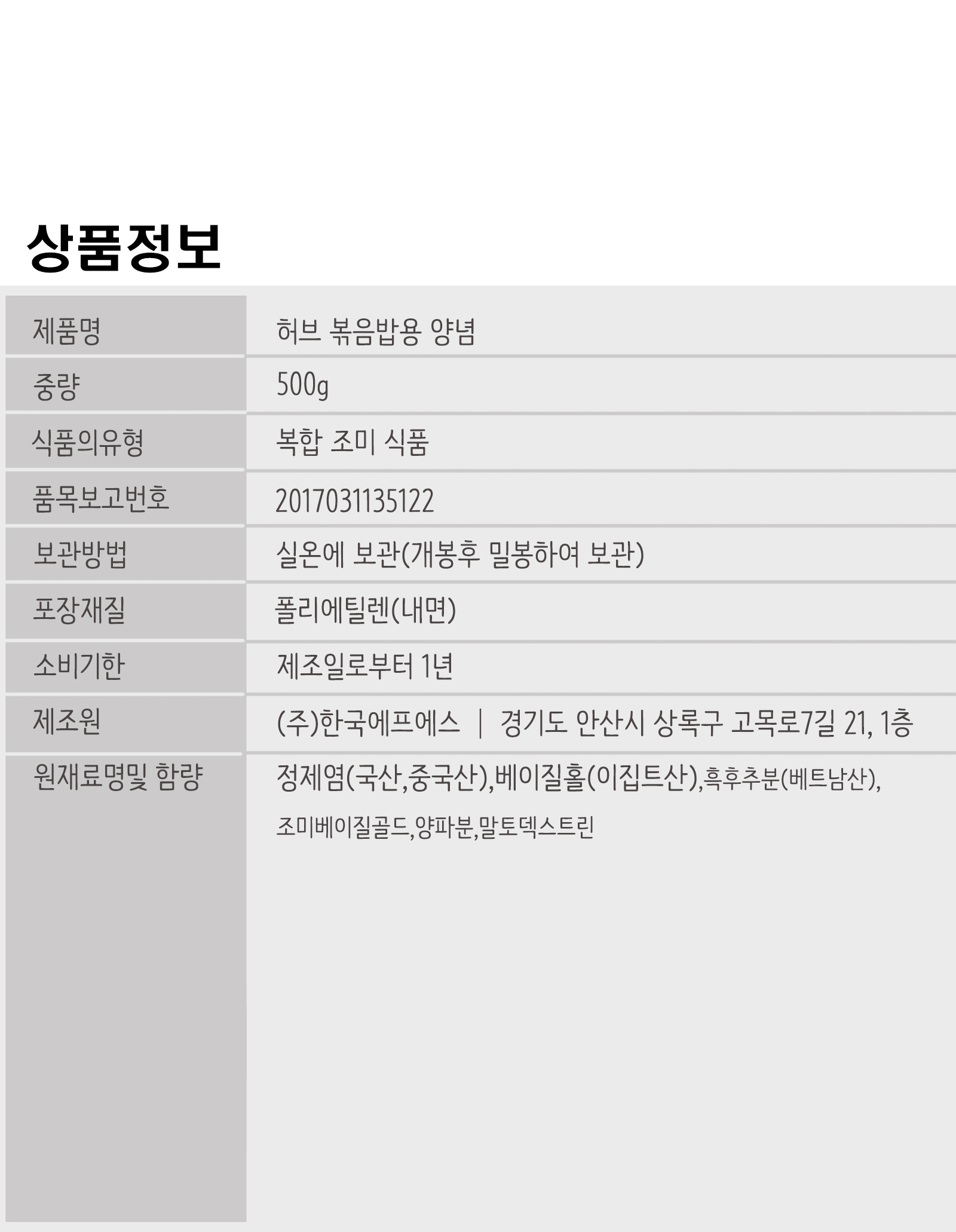 제조사 (주)한국에프에스 원산지 베이질홀(이집트산), 정제염(국산), 흑후추분(베트남산